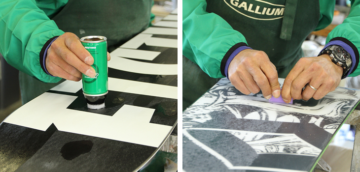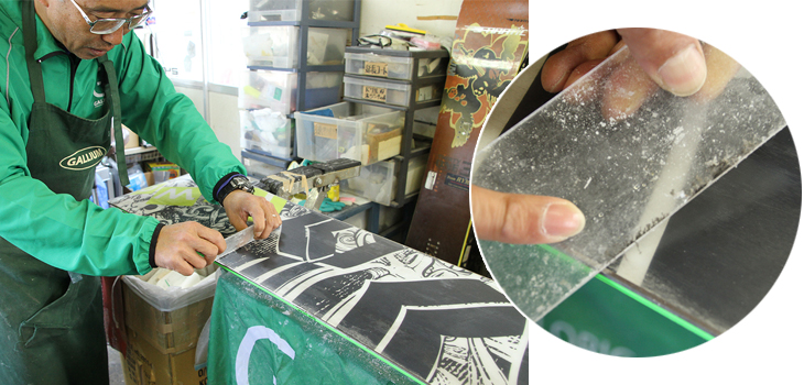 板にホットワックス塗っている人は、まずはスクレイパーを使って古いワックスを削りとりましょう。ある程度汚れが取れたら、リムーバーをソールにつけて汚れを浮き出させます。
