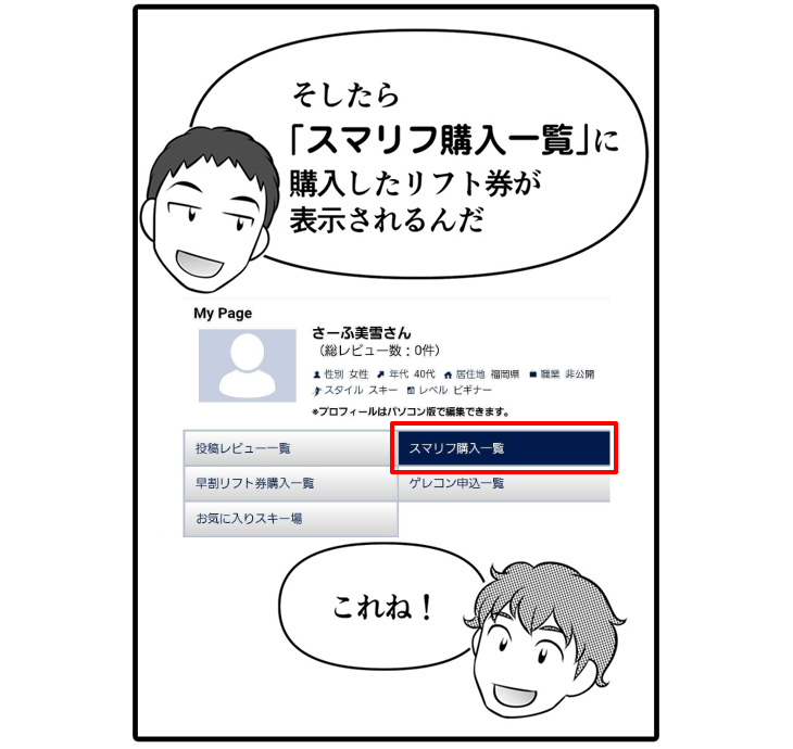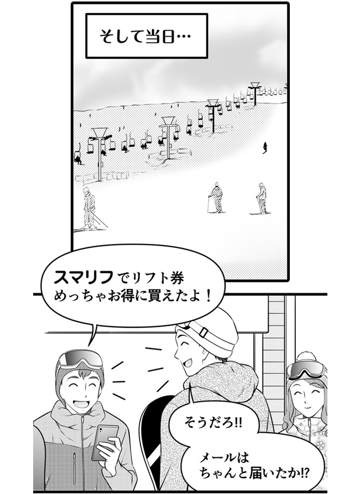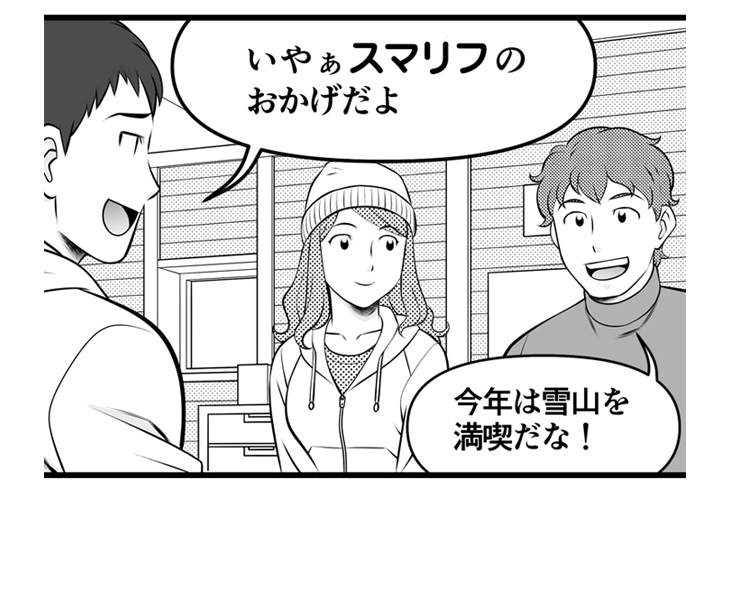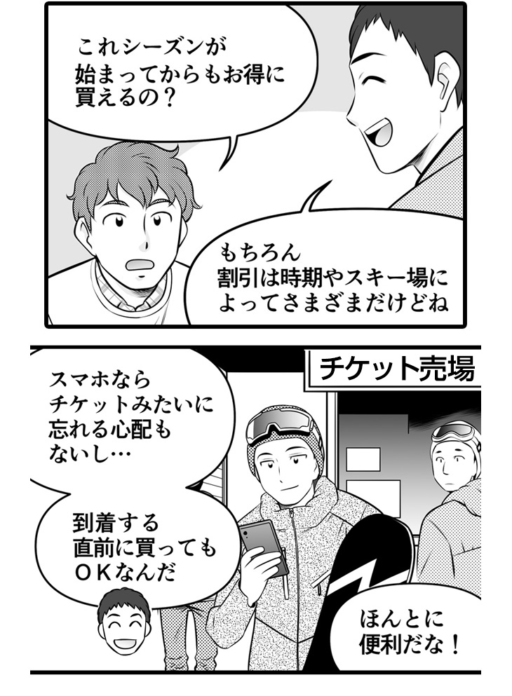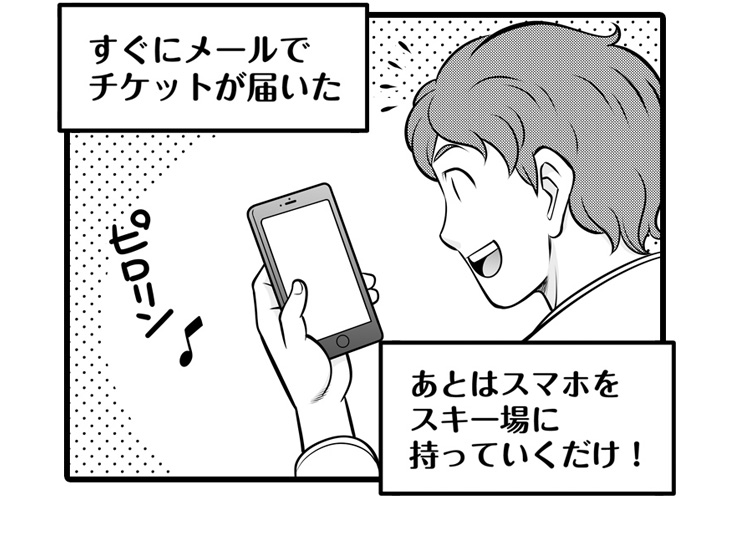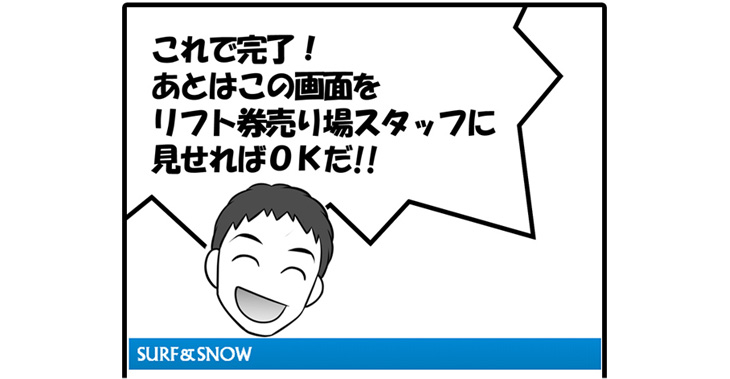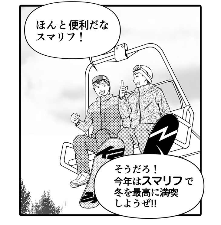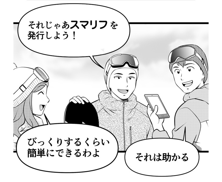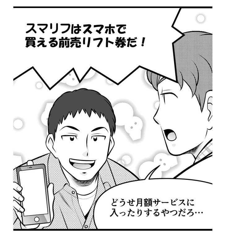 その答えを言ってしまいましょう・・・ズバリ!SURF&SNOWの「スマリフ」というスマホで使える(電子)リフト券サービスです!これから、スマリフのメリットや使い方をマンガでできるだけ分かりやすくお伝えしていきます。