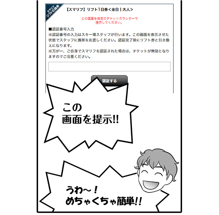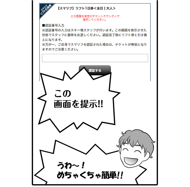 ちなみに、誤ってリフト利用日以外に、リフト券の発券手順を進めてしまったとしても、この認証キーの入力がなければ利用扱いにはなりませんので、安心してください。スマリフは操作もとっても簡単なので、ぜひどんどん活用して、スキー・スノボを一回でも多く楽しんでください!(くれぐれもスマホだけは持参してくださいね!)