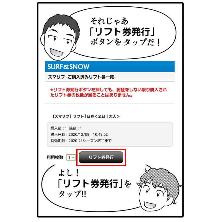(利用日当日に、 購入された場合はそのまま発行しても大丈夫です)「スマリフ発行URL」をタップすると発行画面へ移行します。SURF&SNOW会員の方と非会員の方で表示される画面が異なりますが、手順はほとんど変わりません。