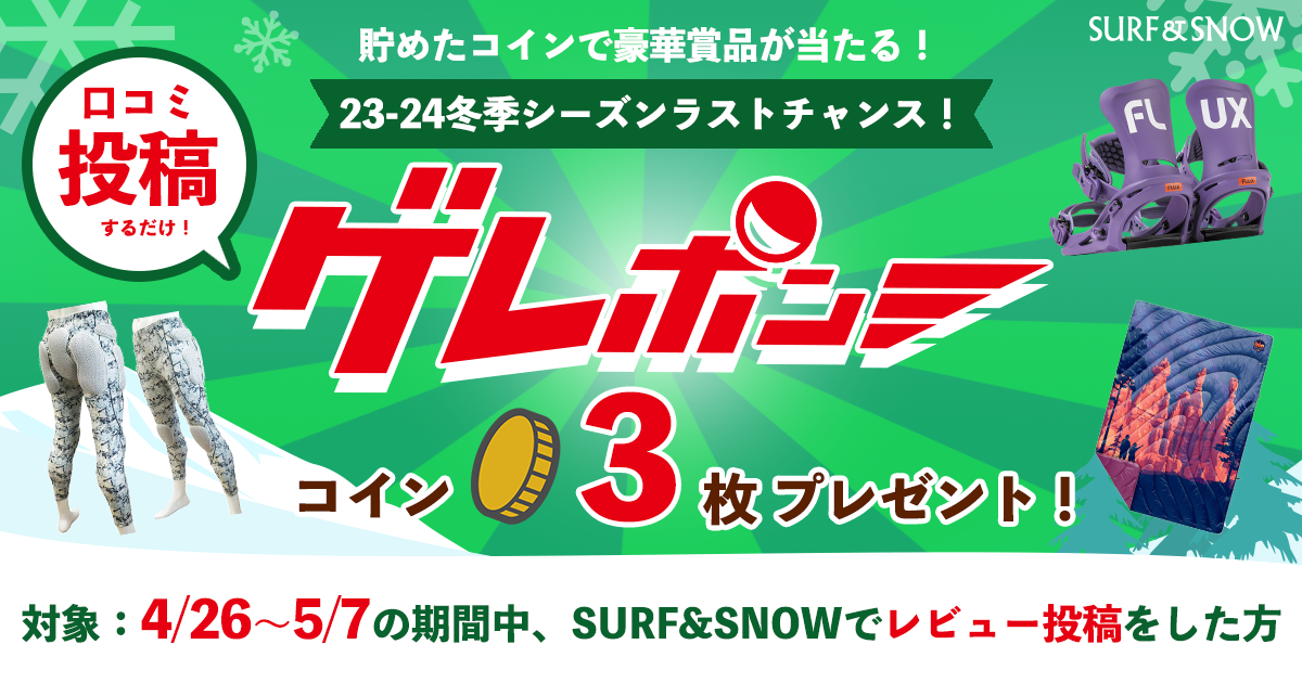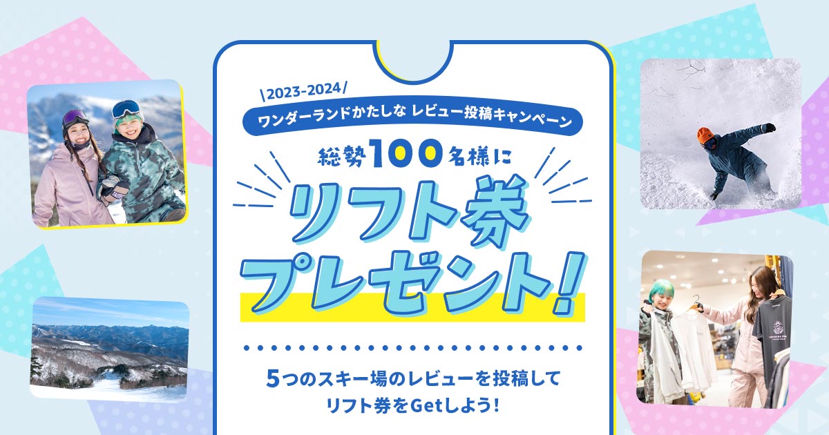 本日から4/26~5/7までの期間中、スキー場のレビューを投稿していただいた方全員にゲレポンコイン3枚をプレゼント!ぜひ現在開催中の「ワンダーランドかたしなレビューキャンペーン」に参加したり、ハイシーズンの思い出をレビュー投稿してください。貯まったゲレポンコインは、その場で豪華賞品が当たるゲレポンキャンペーンにお使いいただけます。オトクなこの期間をお見逃しなく!