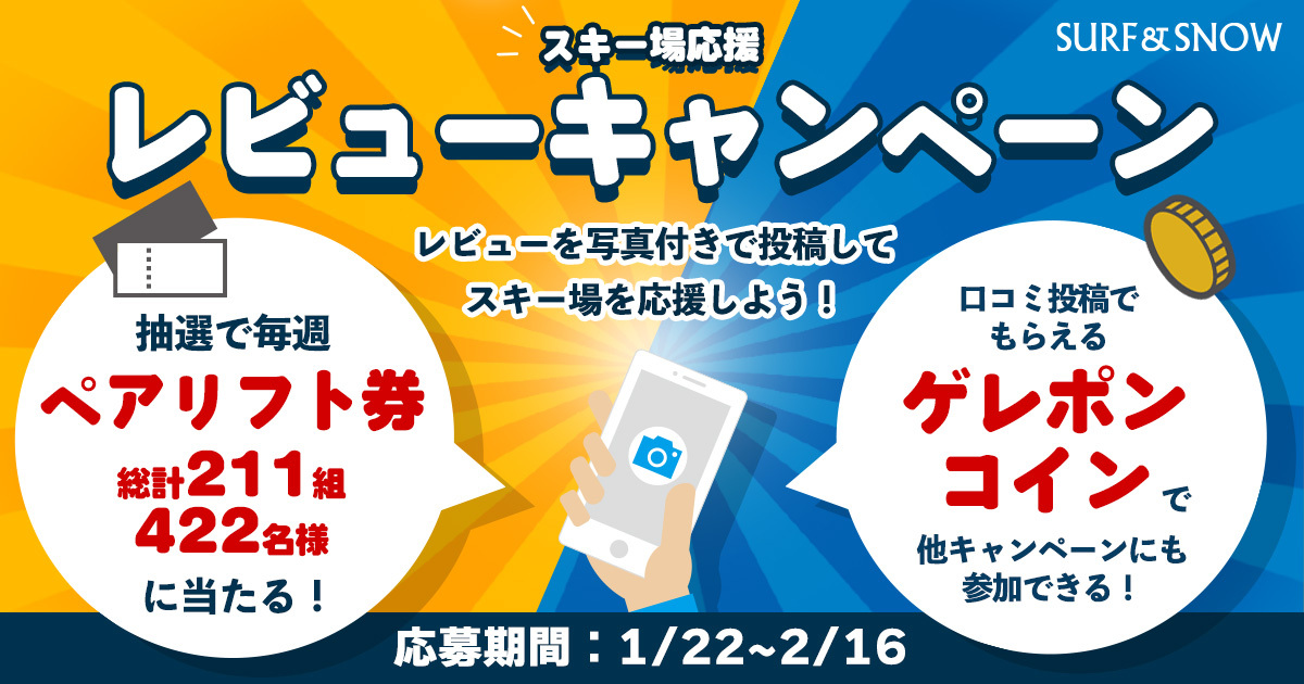 スキー場のレビューを写真付きで投稿した方の中から、抽選で総勢211組422名様にリフト券をプレゼント♪レビュー投稿した方には、もれなくゲレポンコイン1枚がもらえます。ゲットしたゲレポンコインは、下記のゲレポンプレゼントキャンペーンに参加できて楽しさ倍増!あなたの冬の思い出を写真と一緒にレビュー投稿して、スキー場を応援しませんか?