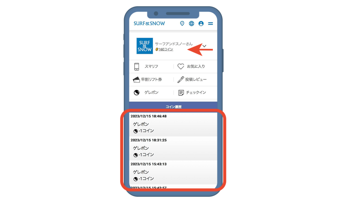 ゲレポンは、SURF&SNOWのチェックインやレビュー投稿などでコインを獲得し、それを使用してガチャにチャレンジし、当たりが出ると豪華賞品がもらえるというコンテンツです。