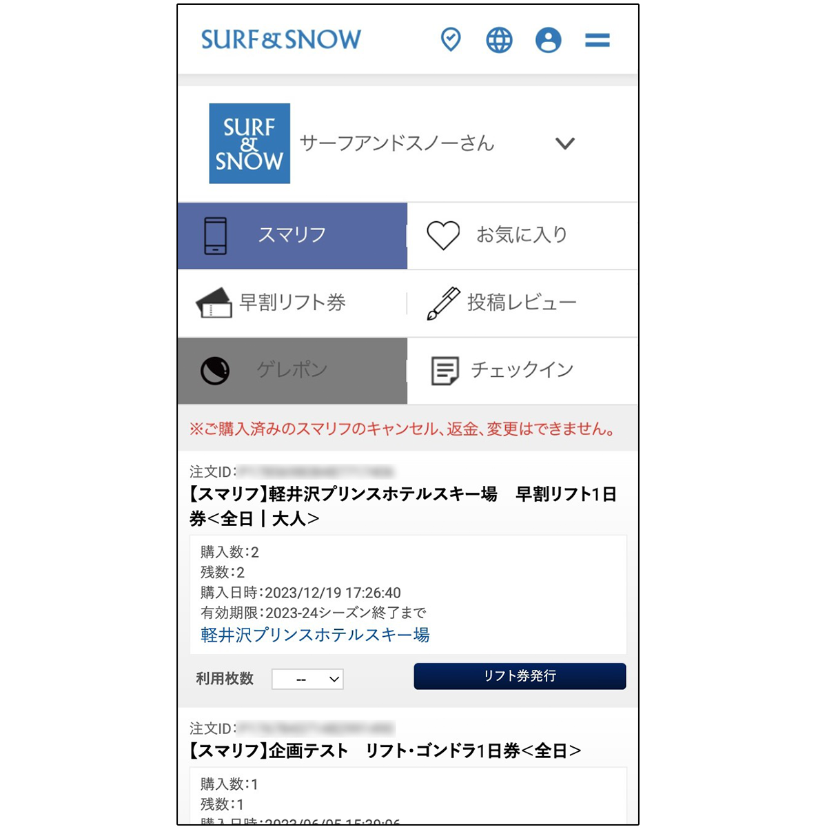 早割・スマリフともにSURF&SNOWで購入したリフト券購入履歴が見やすくい!