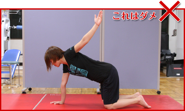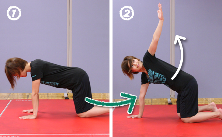 手とヒザを床につき、腰は回さず片手を横に広げてそのまま真上に。手のひらは頭の方向に向け、顔も上げて指先を見る。胸が開いて肋骨が動くのを感じ、背骨がねじれている感覚を意識しながら、そのままの姿勢で10秒。左右とも行う。
