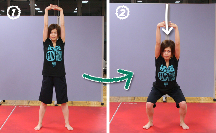 両足を肩幅に広さに開き、指を組んで腕を上げる。そのままゆっくりお尻を真下におろして10秒ストップし、またもとの姿勢に戻す。これを3セットと行いましょう。