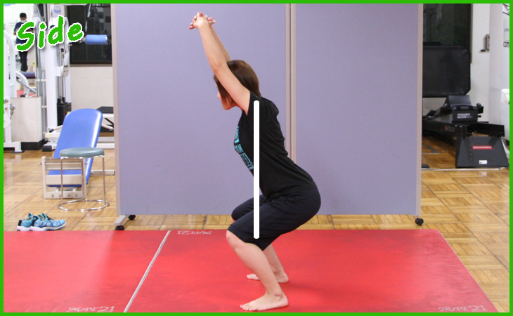 腰をややそらし、体の軸が床と垂直になるイメージで。お尻を下げるときは、ヒザが割れてガニ股にならぬよう注意。