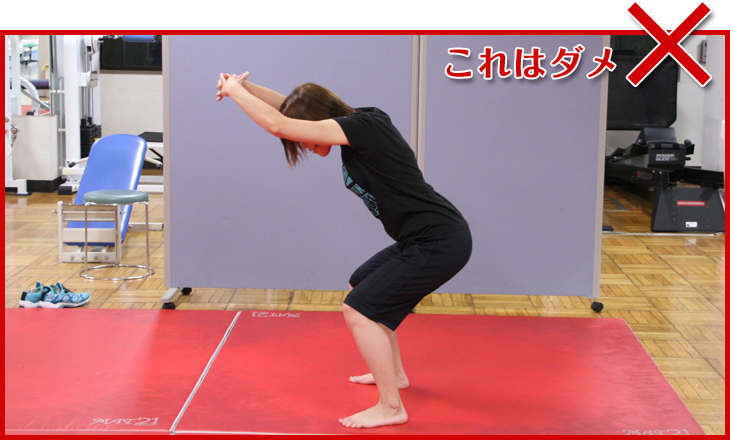頭が前に倒れてしまうと、腰が折れて背骨や腰が逸らせない。体の軸をまっすぐにしたまま、お尻を下げるイメージで。