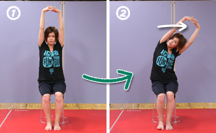 イスに座り、指を組んで両手を上げる。ヒジを曲げずに体を横に倒し、腰から脇下までしっかり伸ばす。これを左右に10秒×3セット行いましょう。