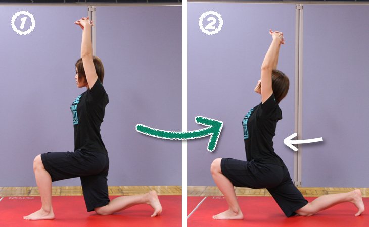 片ヒザを立てた状態で、指を組んで両手を上げる。後ろ側の足はつま先は立てた状態で。そのまま腰を前に突き出し、モモ、背中、股関節が伸びるのを意識する。10秒その姿勢を保ったら、ゆっくりと最初のポーズに戻る。同様に足を替えて行う。