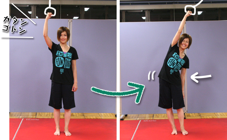 揺れに合わせて体のサイドを伸ばし、さりげなく体幹トレーニングを。