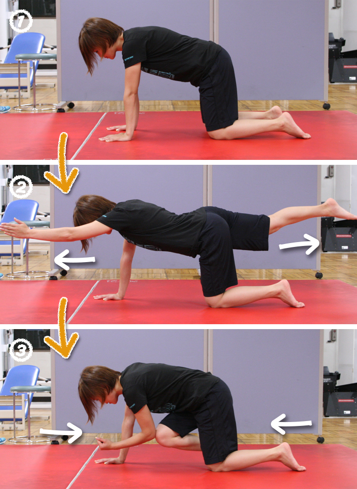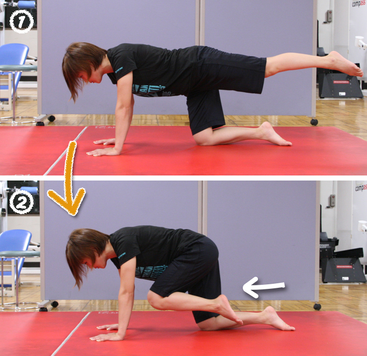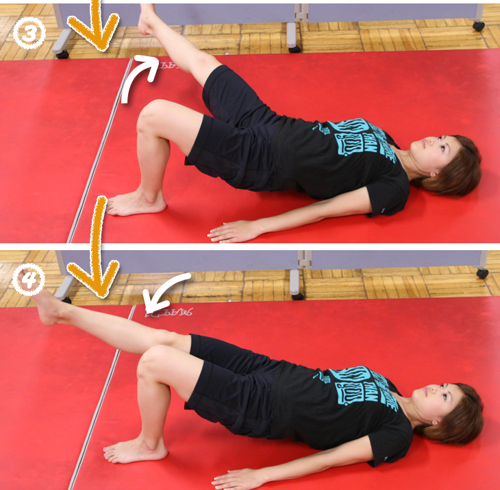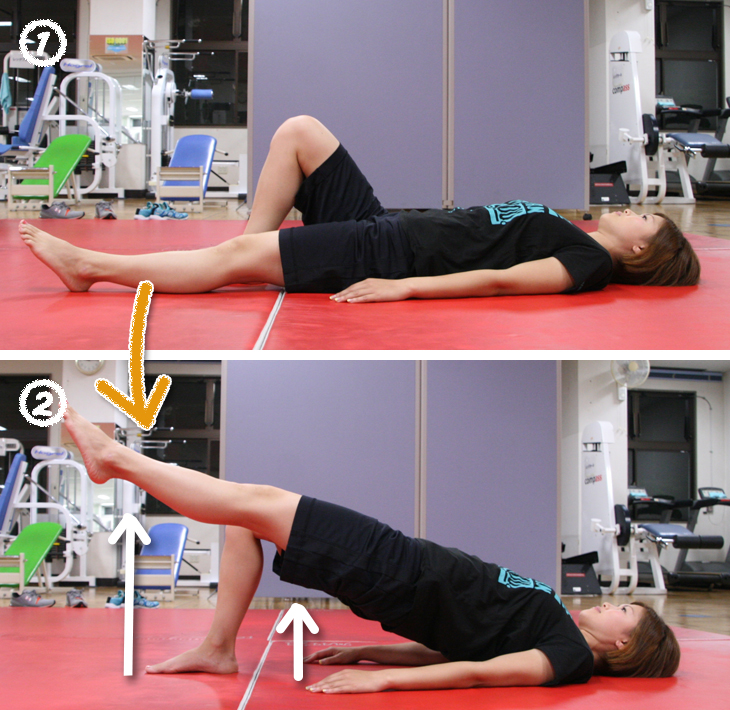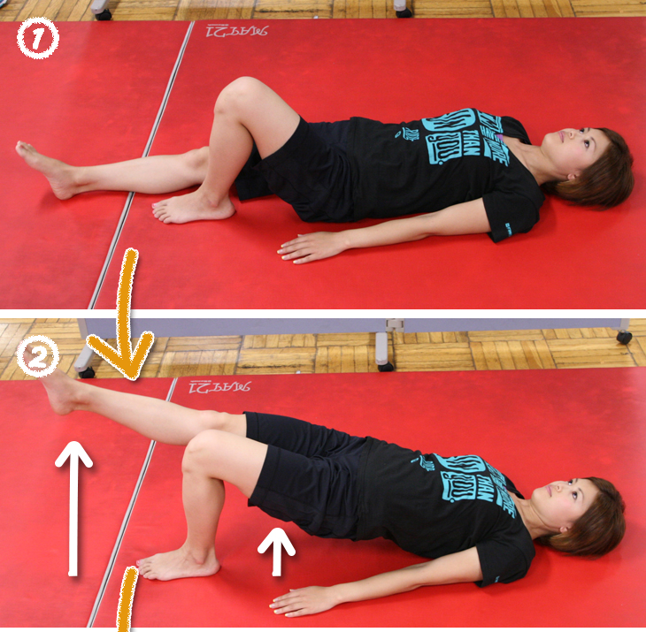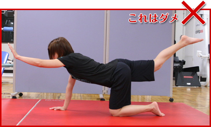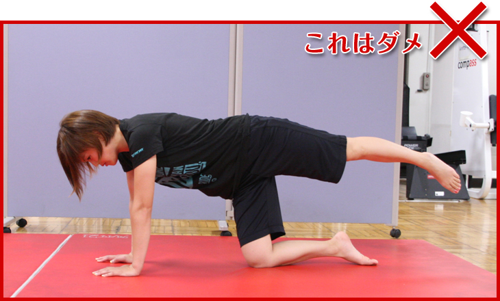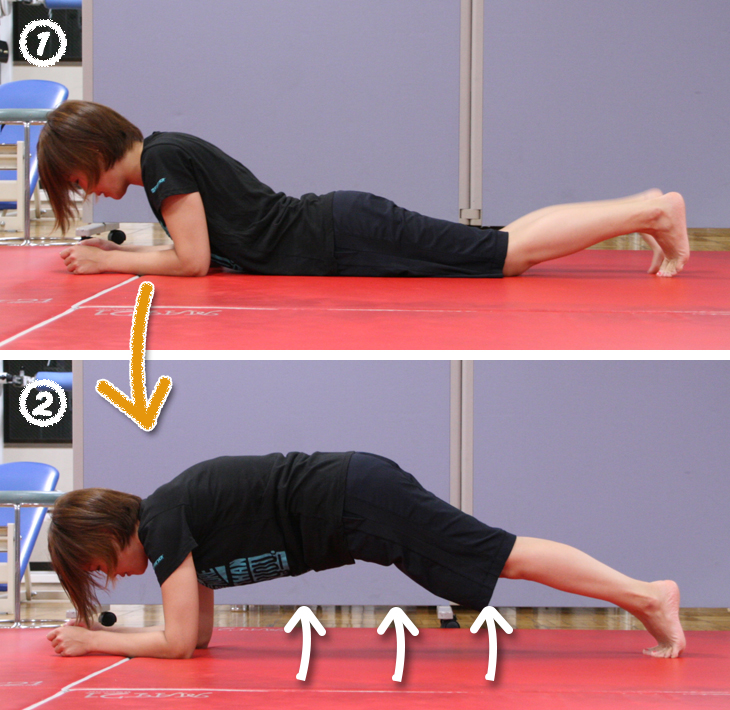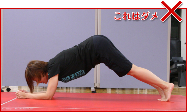 お尻を締め、頭から足までのラインが一直線になるイメージで姿勢をキープ。顔を正面に向けるとよりグッド。