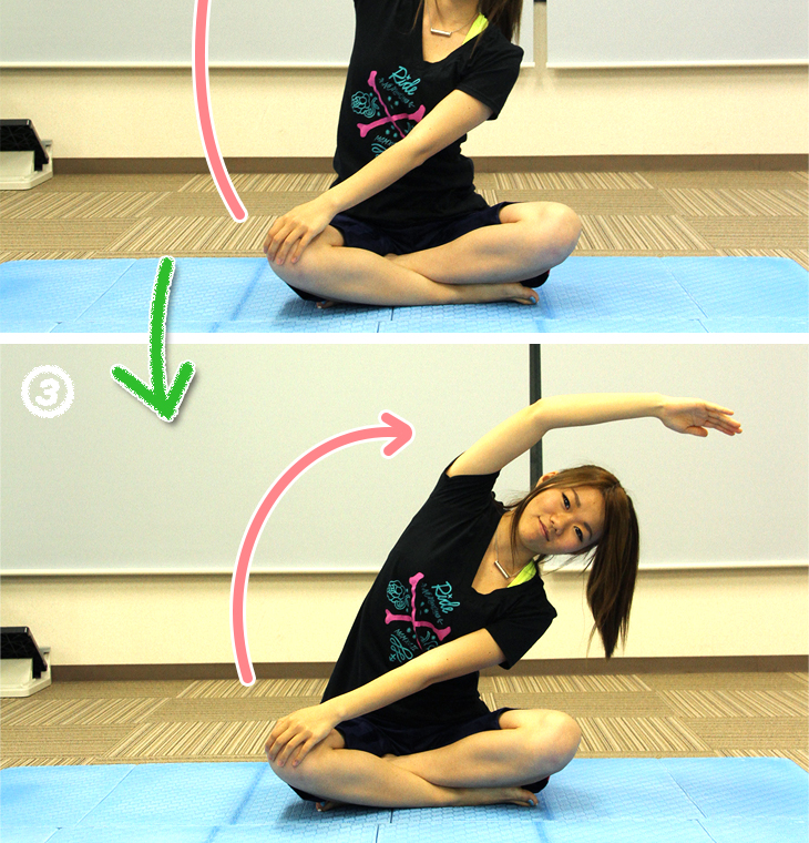 ③脇腹が伸びているところで10秒キープ。