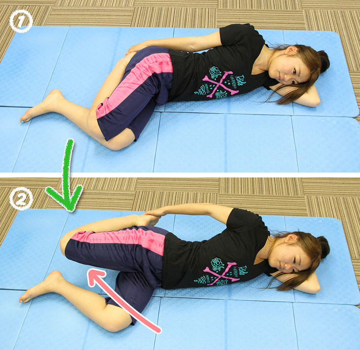 ①横に寝転び、上側の脚を曲げてつま先を手でつかむ。