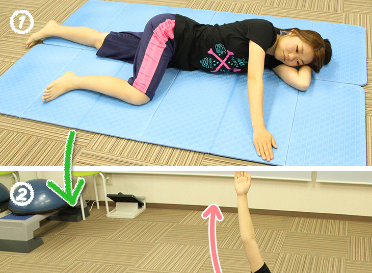 ①片腕を枕にして横に寝転び、反対の腕は手を前に伸ばす。上になる脚を90度に曲げる。