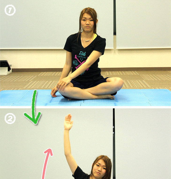 ①あぐらをかいて背筋を伸ばして座り、片方の手を反対側のヒザに置く。