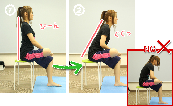 ①背筋を伸ばして椅子に座り、片方の脚をかかとをつけて前に伸ばす。