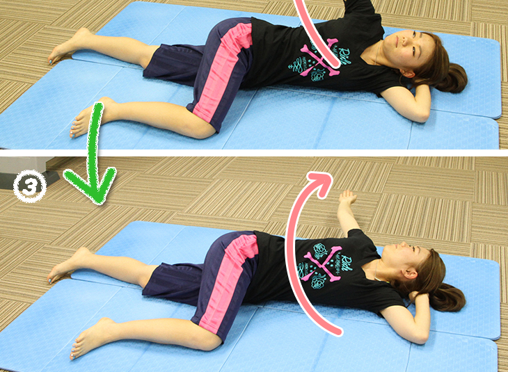 曲げているヒザが浮いてしまうとひねる効果が軽減。床につけた状態を保とう。
