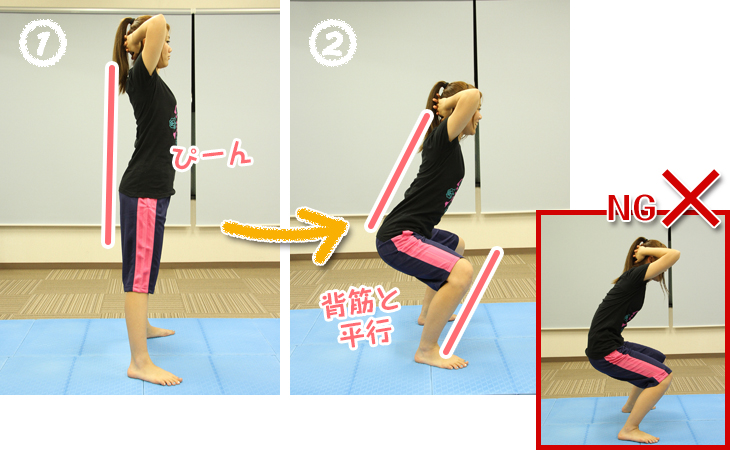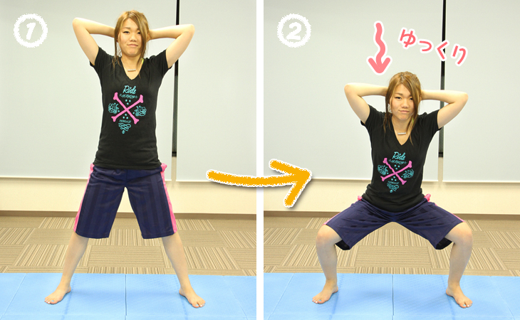 ②ヒザとつま先を同じ方向に向けたまま、3秒かけてゆっくりとふとももが床と並行になるところまで腰を落とし、同様に3秒かけて元の姿勢に戻る。