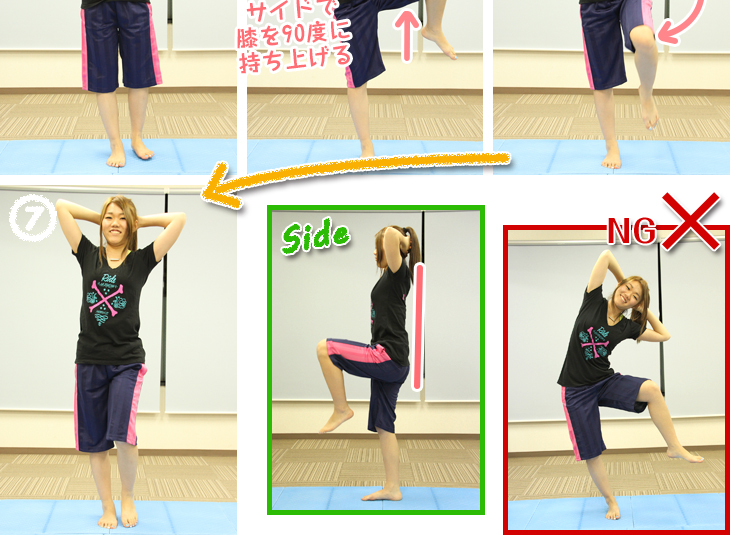 ⑤10回外側にまわし終わったら、今度は後ろかヒザを90度に曲げて脚部を持ち上げる。
