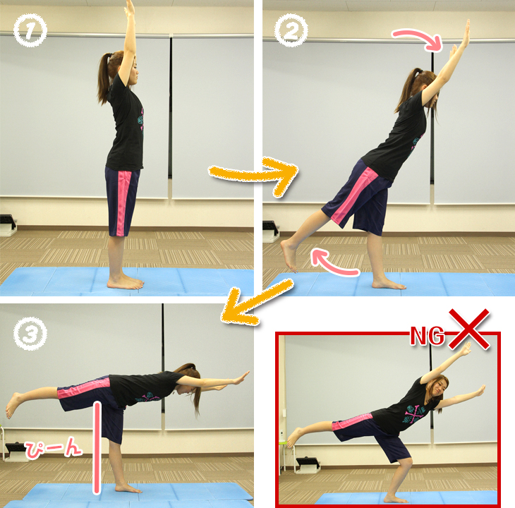 ②手を伸ばしたまま上体を前に倒す動作に合わせて、片脚を後ろに上げる。