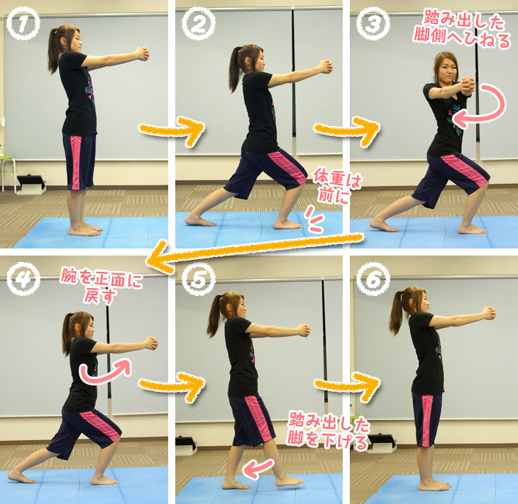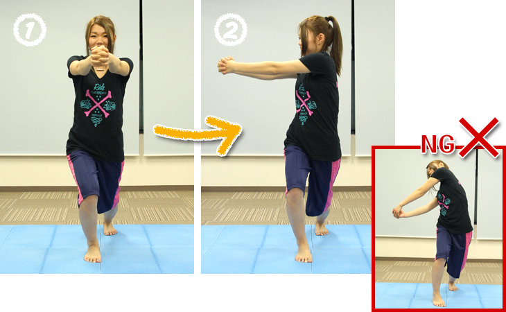正面から見ると・・・踏み出した脚が内側に倒れないように注意。体幹をひねるときにヒジはなるべくまっすぐのままで。