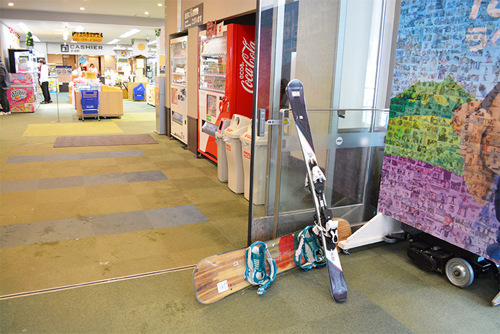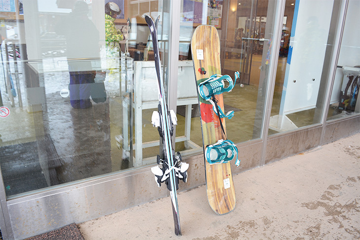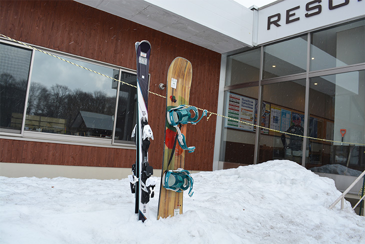 レストランやセンターハウスの周辺には、スキーやスノーボードを立て掛けるスペースや器具が設置されています。スキー場で食事や休憩をする場合はこれらの場所にスキーやスノーボードを置きます。