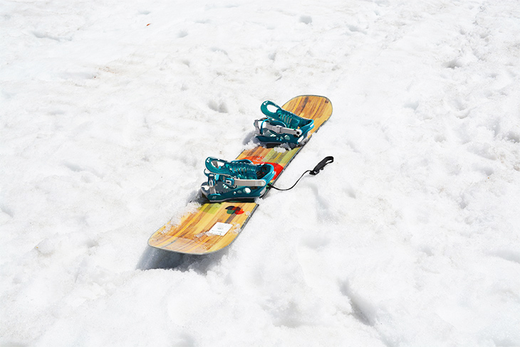 スノーボードはソールを下にして置かないこと。ボードが滑って人に当てたり、モノを破損する危険があります。スノーボードを置くときは裏返し、バインディングを雪面に押し付けて置きます。