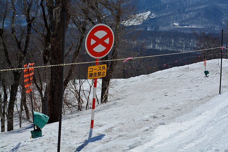 滑走禁止の看板やロープがはられている場所は絶対に侵入しないこと。コースはスキー場が管理外であり、雪崩や遭難に巻き込まれ、捜索や救助が行われた場合の費用が自己負担になることも。コース外の救助活動はコース内よりも非常に時間がかかります。