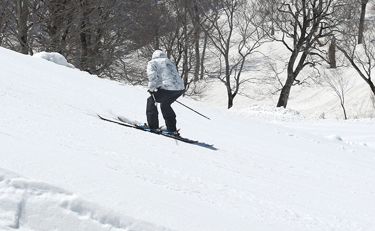 登りがキツくなるので、上がっていく時に減速しますが、そのぶん下っていく時の加速も感じることができると思います。浅くターンしている時よりも後傾になりやすいので基本姿勢のイメージを強く心がけておきましょう。
