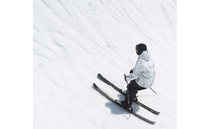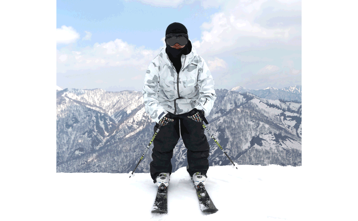 基本姿勢は肩幅程度のスタンスで、真っすぐ立っている状態からストンと重心を落とした、いわゆるスキーの基本姿勢と変わりません。ハーフパイプでは、登りの動きと下りの動きが繰り返されるため、いつの間にか後傾気味になってしまったり、姿勢が崩れることがよくあります。少し前傾をキツめに入れたくらいがちょうどいいと思います。