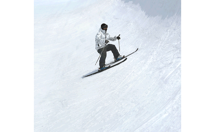 また、頂点に来た時の斜面の角度もキツくなってきます。真上に伸び上がる時に、浅いターンの時よりも身体の縦の中心線が斜面に対してほぼ垂直になるようなってくるはずです。重心は常に両板の中央にあるように両足で伸び上がるように気をつけましょう。