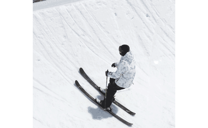 では、まずはアプローチです。リップのラインに平行に進みましょう。必要以上にスピードをつけないように注意します。ハーフパイプに入る時は、ボトムに向かって飛び降りるのではなく、上半身が壁に対して垂直になるように前に落とし込んでいきます。なるべく壁の上部から雪面とスキー板が接するようにイメージしてもらうと、ボトムまでジャンプしてしまうことはなくなるかと思います。