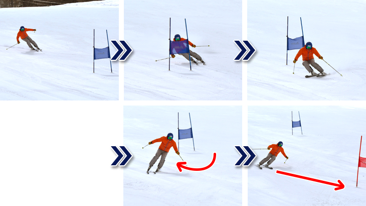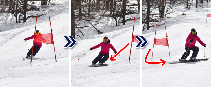 また、ポールを通過してしばらく進んでから次のターンを始動する人がいますが、それではタイミングは遅すぎてポール近くを通れません。エッジを切り替えるタイミングは、写真のようなポールを通過してすぐの位置です。