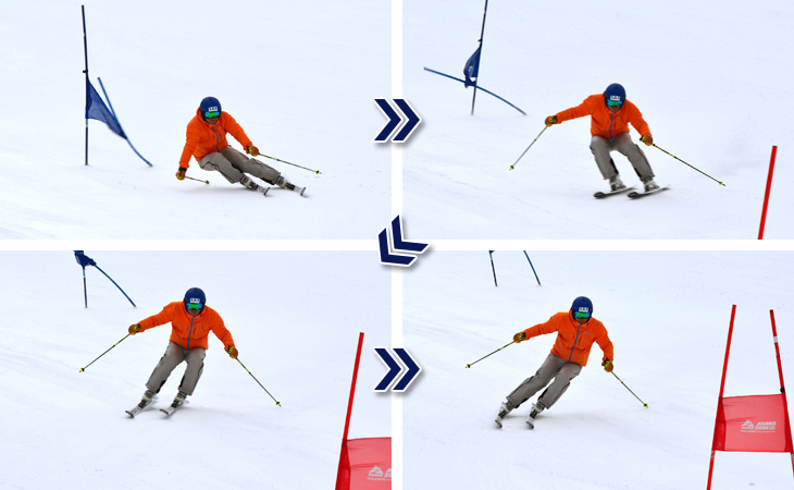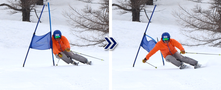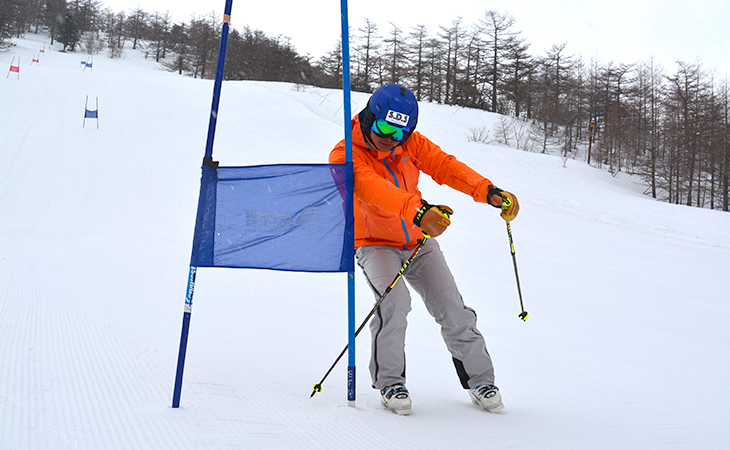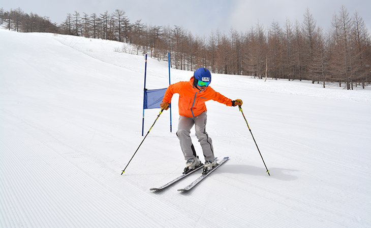 ポールとポールの中間点で次のポールに入る体勢を整えられ、狙い通りのラインで攻められます。また、ポールではスタンスを広めに取ると、滑りに安定感が出ます。