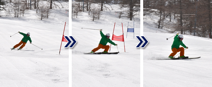 そして、ドリフトを使って切り替える場合。ポール通過後にすぐエッジの切り替えるのは同じですが、そのときドリフトというスキーのずらしを使います。荷重を抜いて板をフラットし、身体の下で板を切り替えます。素早いエッジの切り替えが可能となり、エッジの角付けを瞬時に決める高い技術を伴います。また、ドリフトするタイミングも重要。エッジを切り替えたらポール間を直線的につなぐラインで次のポールを狙います。