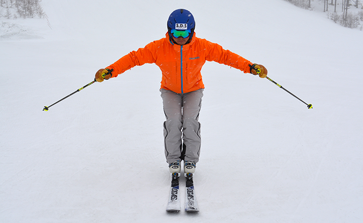 滑走時は写真のようにスタンスを広めに取り、腕を大きく広げる姿勢を意識。体勢が安定し、エッジを雪面に噛ませやすくなります。