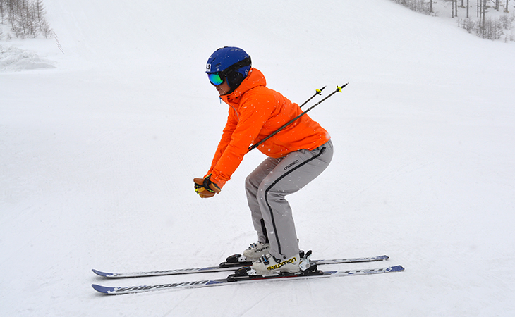 これはスタンスが狭いダメな姿勢。クローズドスタンスだと不安定で動きが窮屈になり、スキーコントロールがしにくくなります。
