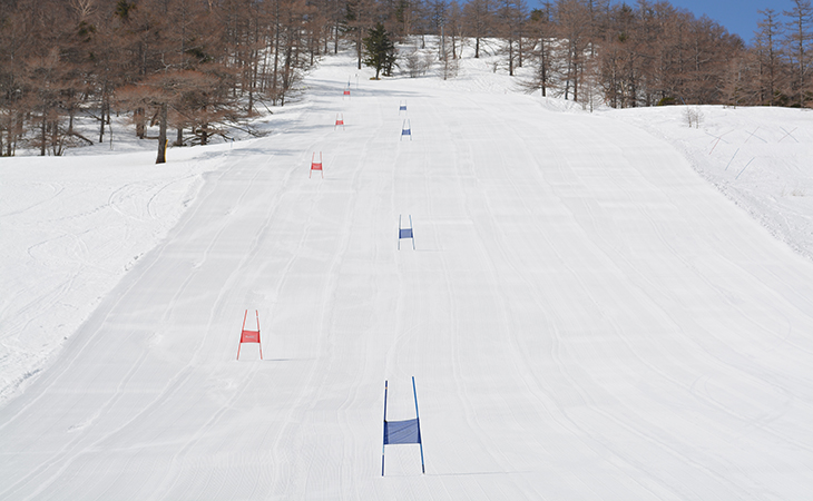 アルペンスキーにはいくつかの種目があり、滑走距離や標高差、旗門数などが異なります。ゲレンデの常設ポールバーンなどでよく目にするのは、SLやGSのセッティング。写真はGSのセッティングです。