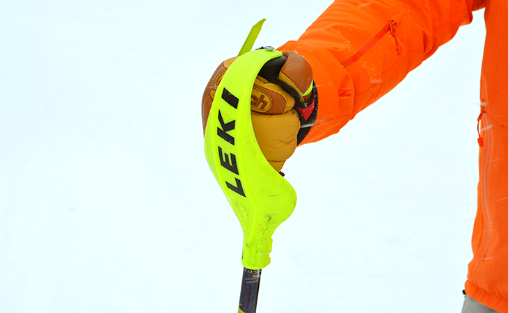 写真はパンチカード。ポールを拳で倒すSL競技で用いられ、ストックのグリップに装着して手を保護します。ストックも耐久性が高く衝撃に強いレーシングモデルがあり、クローチングで滑ることが多いSGやDHのような高速系種目では抱え込みやすいカーブしたタイプが用いられます。ただし、SLやGSならストレートタイプが主流です。