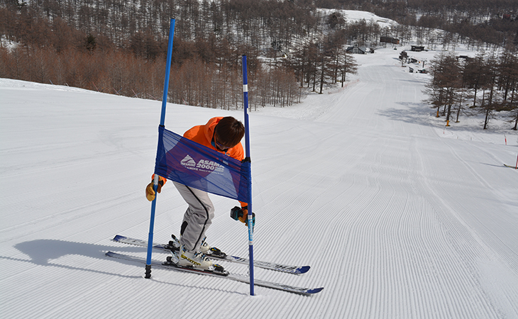 ポールには滑走距離や標高差などが異なるいくつかの種目がありますが、どの種目も基本は赤と青のポールを交互に通り、規制されたコースを滑ってゴールすること。途中でポールを通過しそびれても、戻って滑り直してゴールすれば記録が出ます。未通過のままだとゴールしても失格です。