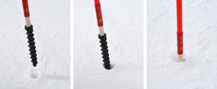 豆知識としてポールの設置方法も紹介しましょう。まず、セッティングを考えながらドリルで雪上に穴を開けます。ポールのスクリュー状になっている方を雪に差し込み、回しながら雪にねじ込んでいきます。スクリュー部分が見えなくなればOK。ポールはまっすぐ立てるようにしましょう。