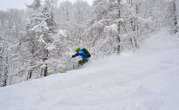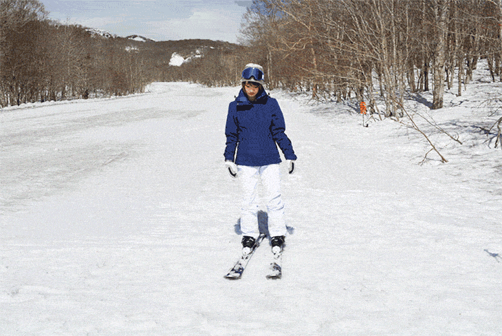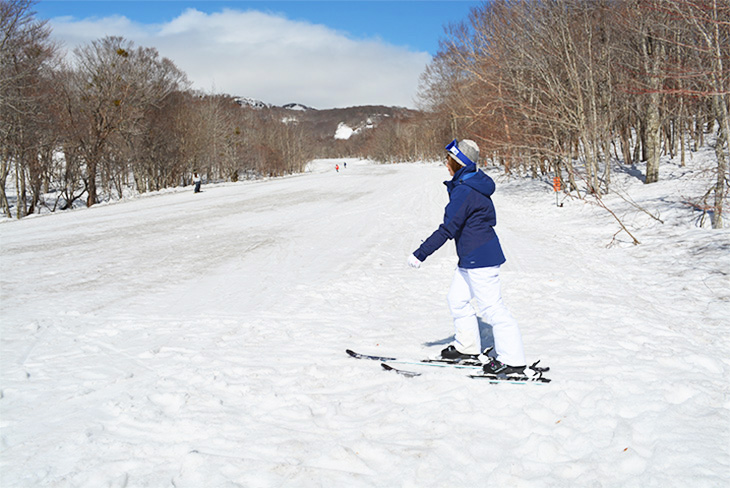 やや大股に足を開き、スキーを滑らせながら進んでみましょう。腕を大きく振り、前に滑らせたスキーに体重を乗せるのがコツです。ここまでできれば、平地でスキーを履いて移動するのはもう完璧です。