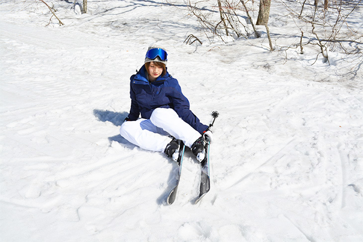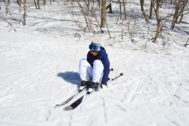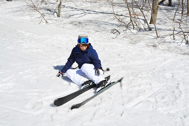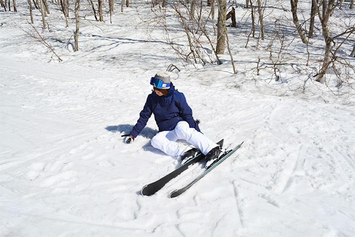 転ぶときは、立った状態から斜め後ろに向かってお尻から転びます。転ぶときは無理に手をついたりせず、お尻を雪面につけましょう。このときお尻は両足の外側につけること。スキーの間にお尻をつくと、止まらずにそのまま滑って行ってしまいます。