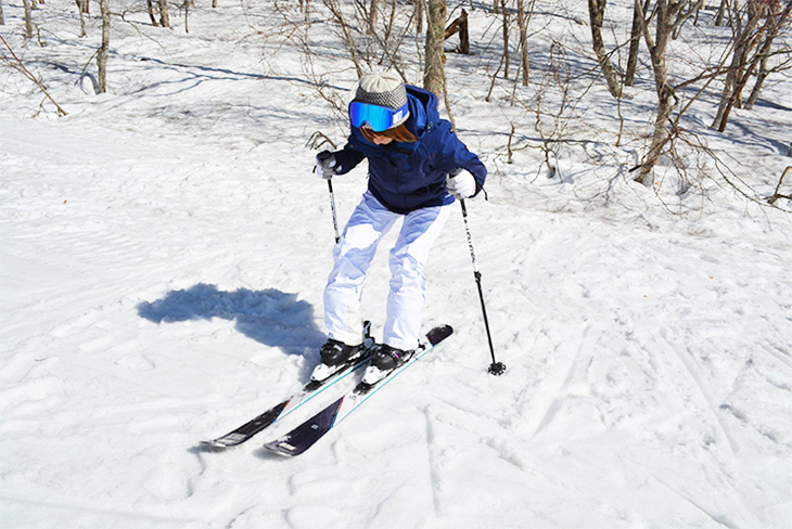 立ち上がるときに足が開いていると、スキーが滑ってスムーズに立ち上がれません。スキーは平行にして体に近づけ、安定した状態で立ち上がります。