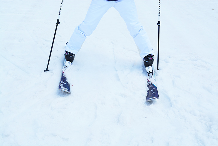 スキーを小さなV字にして斜面の下を向いたら、エッジの角度を緩めてゆっくり進みます。斜面の下まできてスピードが遅くなったら、テールを開いて大きなV字にして止まります。
