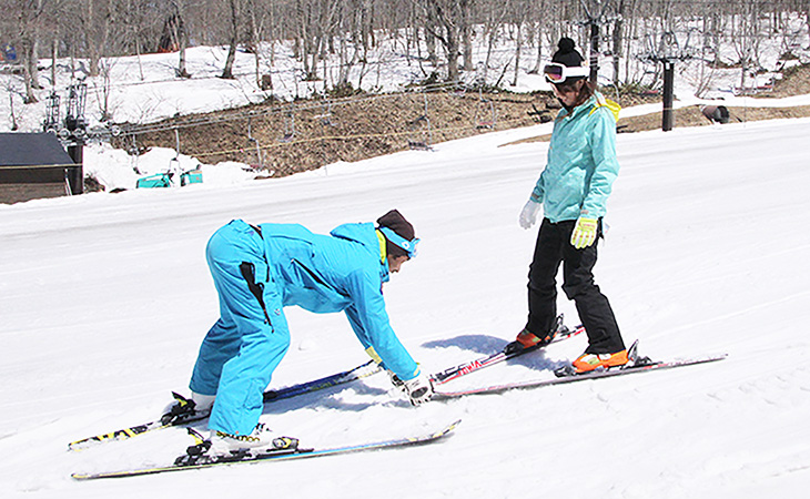 スキーのトップが重なってしまうときや、滑り出す前にエッジを立てて止まっていられない場合、滑り慣れた人にトップを持ってサポートしてもらいましょう。