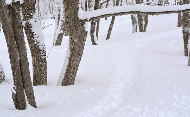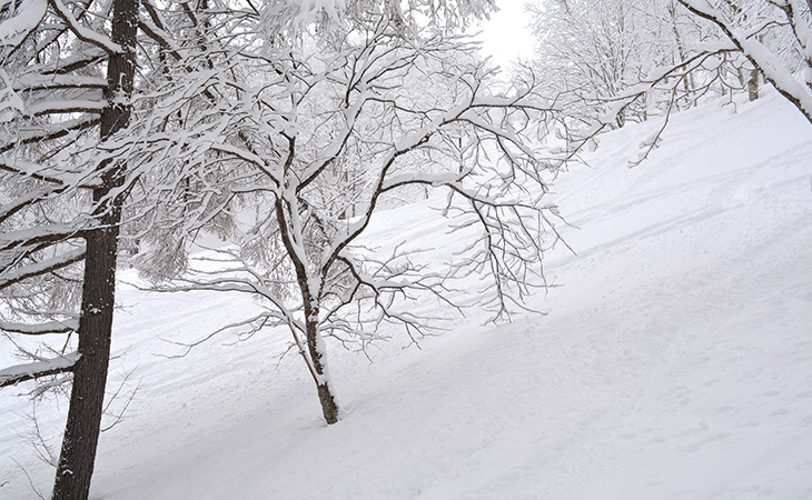 滑走が認められているナチュラルバーンでコースを示す目印があれば、それに沿って進みましょう。また、木には近寄らないこと。木の回りは窪んで落とし穴のようになっており、積雪が増える穴が深くなり大変危険です。風などの影響で穴が見えなくなっていると、いきなり穴にはまる「落とし穴」のような状態に。穴から抜け出せないシリアスな事故の事例もあるので、木の近くは通らないようにしましょう。