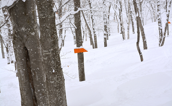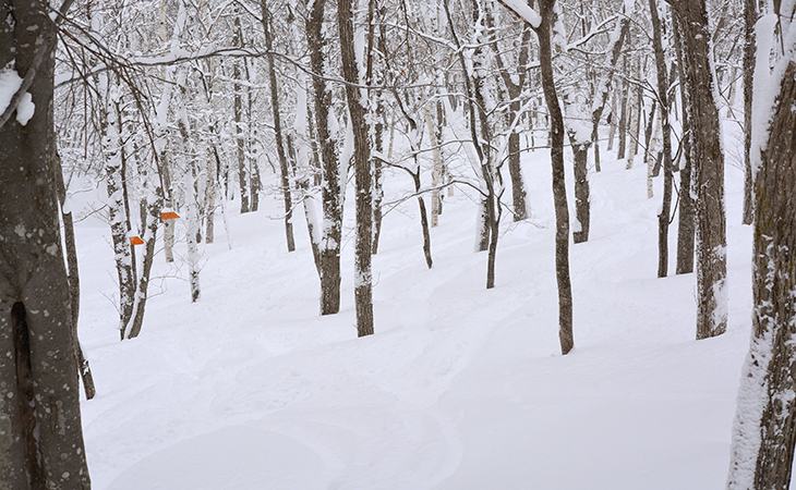 滑走エリアとして開放された森の中は、進入禁止エリアを除き、どこを滑るのも自由です。落葉樹の森なら冬は樹の葉が落ちて視界が開け、夏の森より景色が広く感じられ、ライン取りも思い描きやすくなっています。