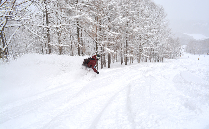 降雪時の非圧雪エリアはどこもかしこもパウダーだらけ。ワイルドな斜面をダイナミックに滑れます。